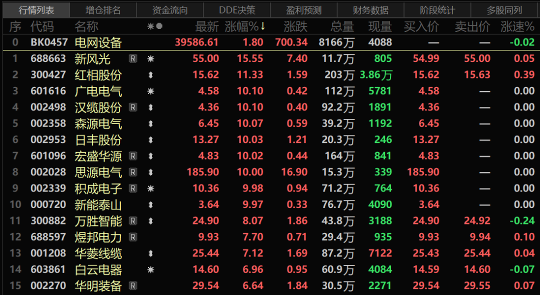 1月16日,电网设备概念股走强。截至收盘,新风光涨超15%,广电电气、汉缆股份、森源电气、思源电气等多股涨停。