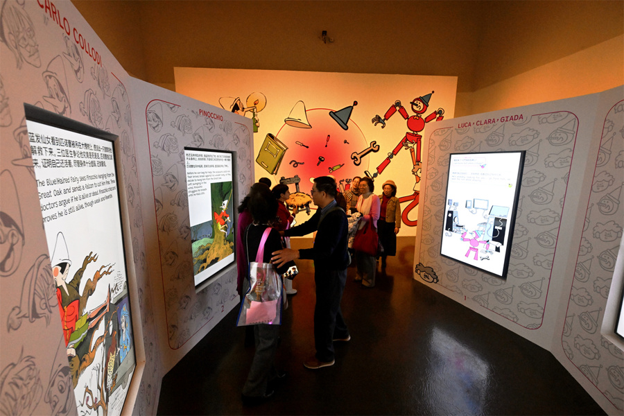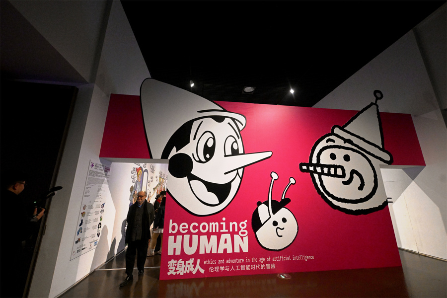匹诺曹是在中国家喻户晓的意大利民间故事。国际策展人、米兰理工大学终身教授Luca Fois就以匹诺曹为灵感,创新性地讲述了“机械匹诺曹”通过体验情感和共情最终成为人类的故事,由此诞生了作品《变身成人》。设计师认为,在当代社会中,人类应借助科技变得更加富有人性,我们或可领悟,人工智能能学会观察世界,但唯有触及如童年般的好奇、敏感与开放,它才能真正触及存在的意义。该作品结合意大利插画设计和互动元素,激发观众关于科技与人性的思考。