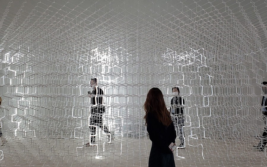 设计师杨明洁为上海艺术设计大展定制的空间作品《虚山水》,用蜂窝状的屏风呈现出一种数字虚拟时代的美学特征:人工、虚拟、高效、精确,细胞化单元体不断解构重组,呈现网络时代的碎片化构造。而其所营造的画面感则与东方人文美学中的“虚空与留白”不谋而合。
